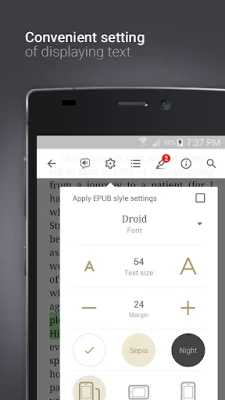 ودّع تعب العيون واستمتع بمتعة الاستماع مع خاصية القارئ الآلي المبتكرة في eReader Prestigio: eBook reader، والتي تحوّل أي نص إلى صوت مسموع بلغات متعددة. انغمس في عالم القصص بينما يقوم التطبيق بالقراءة لك، مع إمكانية تعديل النُسق والخطوط والأحجام لتناسب ذوقك الشخصي ومزاجك. يوفر التطبيق أدوات قوية لتعزيز تجربتك، مثل الوضع الليلي المريح، وإدارة متقدمة للمكتبة لتصنيف كتبك بسهولة، بالإضافة إلى القواميس المدمجة والمزامنة السلسة لملفاتك وكتبك عبر الخدمات السحابية مثل Google Drive، مما يضمن وصولك لمحتواك في أي وقت ومن أي جهاز.