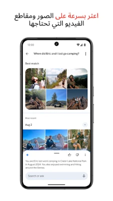تودع صور Google الفوضى في معرض صورك، حيث تقوم بتنظيم محتواك بذكاء لا مثيل له. تجمع الصور المتشابهة والمكررة تلقائيًا، وتنشئ مجلدات ذكية لقطات الشاشة والمستندات، وتخصص ألبوماتك اليومية لتجعل معرض صورك مرتبًا ومصممًا حسب ذوقك. ولتلك اللحظات التي تفضل الاحتفاظ بها بخصوصية تامة، يوفر Google مجلدًا مقفلاً يحمي صورك وفيديوهاتك الحساسة بكلمة مرور جهازك. هل تتذكر متى التقطت تلك الصورة؟ فقط ابحث عنها بوصف طبيعي مثل "أنا وناريمان نضحك" أو "رحلة التجديف في الجبال"، وسيقدم لك صور Google ما تبحث عنه على الفور. لا يقتصر الأمر على التنظيم فحسب، فمع صور Google يمكنك استعادة ذكرياتك المفضلة ومشاهدتها بوضوح تام، ومشاركتها مع أحبائك بكل سهولة، حتى لو لم يكونوا مستخدمين لتطبيق صور Google.